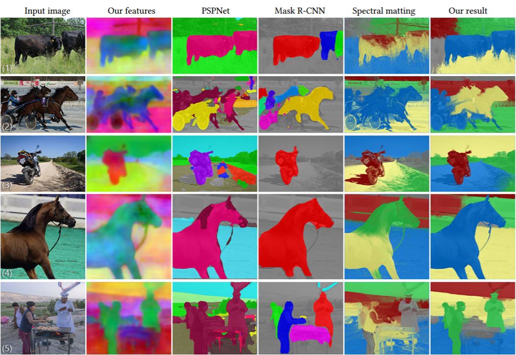 图 9、10:我们展示了我们的结果以及 Zhao et al. [2017] (PSPNet)、He et al. [2017] (Mask R-CNN) 和光谱抠图(spectral matting)[Levin et al. 2008b] 的结果。分割结果在灰度图像上重叠展示,方便围绕分割边界进行更好的评估。注意:PSPNet 和 Mask R-CNN 在物体边界方面不够准确,而光谱抠图的软分割结果超出了对象边界。图源:[Lin et al. 2014]。