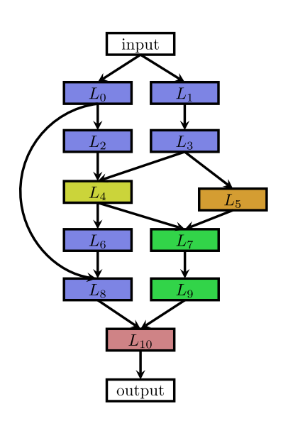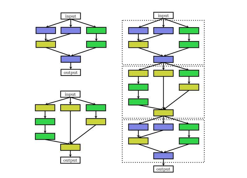 这种结构相当于一个 N 层的序列,每一层有几种可选的算子,比如卷积、池化等,每种算子包括一些超参数,比如卷积尺寸、卷积步长等。 最近的一些工作受启发于一些人工设计的网络架构,研究带有多分支的网络,如下图: