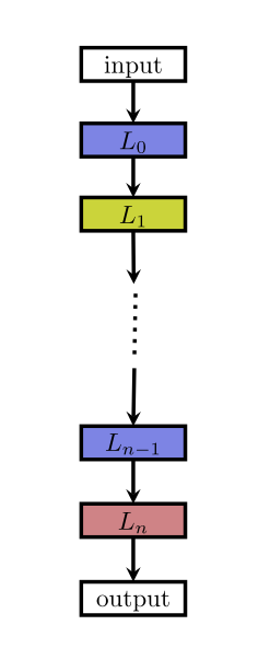 问题定义网络架构和超参数优化的问题,有以下的特点: 1. 评价函数未知,是一个黑箱优化问题,因为评价往往是在 unseed dataset 上进行评价; 2. 非线性; 3. 非凸; 4. 混合优化,既有离散空间,又有连续空间; 5. 一次优化结果的评价非常耗时,大型的深度学习模型参数数以亿计,运行一次结果需要几周时间; 6. 在某些应用场景中,存在多个目标。比如:移动端的模型结构优化,既希望得到尽量高的准确率,又希望有非常好的模型计算效率。 搜索空间搜索空间定义了优化问题的变量,网络结构和超参数的变量定义有所不同,不同的变量规模对于算法的难度来说也不尽相同。 早期很多工作都是用以遗传算法为代表的进化算法对神经网络的超参数和权重进行优化,因为当时的神经网络只有几层,每层十几个神经元,也不存在复杂的网络架构,参数很有限,可直接进行优化。而深度学习模型一方面有着复杂的网络结构,另一方面权重参数通常都以百万到亿来计,进化算法根本无法优化。 但换个思路,假如我们找到了一组网络架构参数和对应的超参数,深度学习模型的性能其实是由这组参数来控制和决定的,所以只需要对复杂模型的架构参数和对应的超参数进行优化即可。 目前常见的一种网络架构是链状结构,如下图: