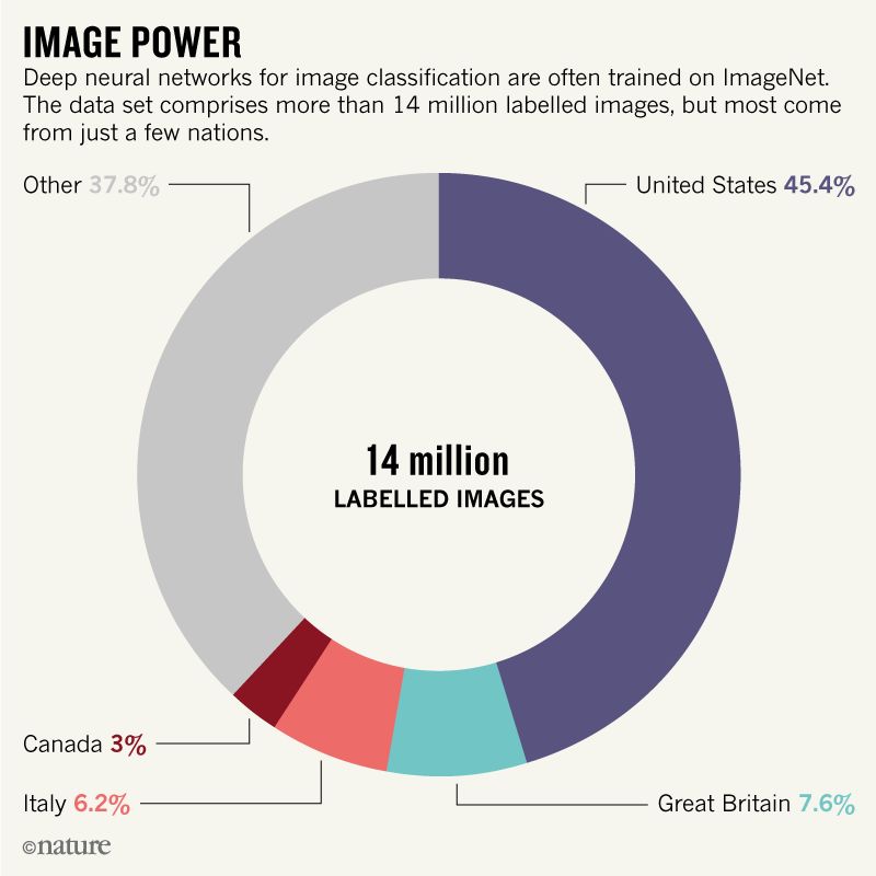 无论是在学术界还是工业界,从发行的出版物和媒体等公开刊物和报道来看,计算机科学家们均倾向于通过训练更加复杂的算法而获得荣誉,而对于数据收集、数据处理和数据组织相对关注较少。 AI产生偏差的主要原因在于训练数据。大部分机器学习任务都基于大规模的、带标注的数据集进行训练。例如,针对图片分类的深度神经网络通常基于ImageNet进行训练,而ImageNet上有着超过1400万张的标注图像集。 在自然语言处理中,标准算法一般基于具有数十亿个单词的语料库进行训练。研究人员通常使用特定查询关键词通过爬取类似谷歌图像、谷歌新闻等网页来搜集数据,或者通过整合例如维基百科等比较容易获取的数据源上的信息来构建数据集。 这些数据集后续通常由研究生或众包平台,如亚马逊众包平台(Amazon Mechanical Turk)进行标注处理。 这些处理方法可能会无意识地让数据产生性别、种族和文化偏见。 通常来说,数据中包含的某些群体占比较高,而另一些群体则占比较少。ImageNet作为推动计算机视觉研究的训练数据源,其中超过45% 的数据来源于美国用户,而这些数据提供者仅占全世界人口的 4%。 相比之下,中国和印度用户总共贡献了 3% 的数据,而这些国家的人口占据了全世界人口的36% 。 这种地理多样性的缺乏从某种情况下解释了为何计算机视觉算法会将一张美国传统新娘的照片标记为"新娘"、"礼服"、"女人"、"婚礼",而将另一张北印度新娘的照片则标记为"表演艺术"和"服装"。 在医学领域,机器学习预测器可能特别容易受到有偏数据集的影响,因为医学数据的生产和标注成本非常高。去年,研究人员使用深度学习从照片中识别皮肤癌。 他们在129,450张图片集上进行模型训练,其中60% 的图片来源于从谷歌图片。但是其中有不到5%的图片是属于深色皮肤人群的,并且该算法并未在深色皮肤人群上进行过测试。因此这个分类器对不同人群的性能可能会有显著变化。 造成偏差的另一个原因是算法本身。