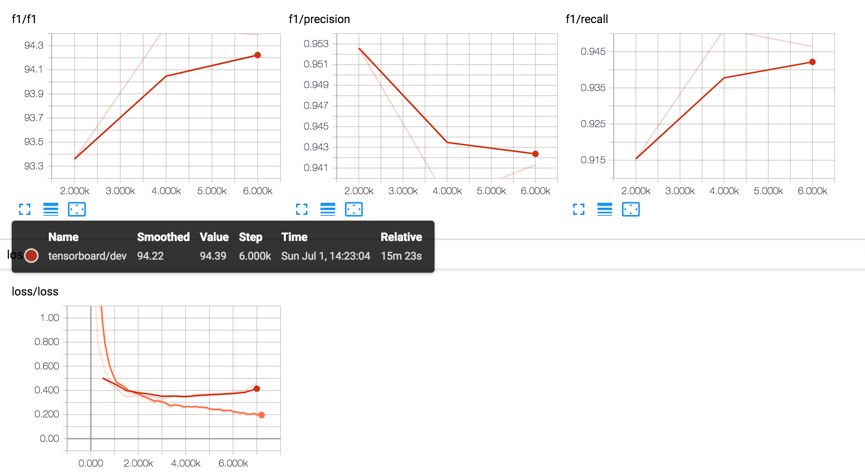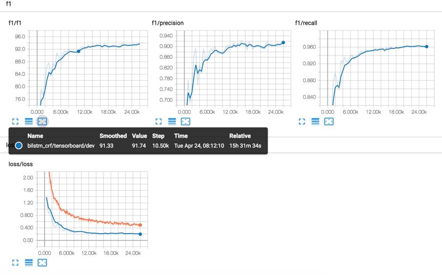 IDCNN对输入句子的每一个字生成一个logits,这里就和biLSTM模型输出logits完全一样,加入CRF层,用Viterbi算法解码出标注结果。 在biLSTM或者IDCNN这样的网络模型末端接上CRF层是序列标注的一个很常见的方法。biLSTM或者IDCNN计算出的是每个词的各标签概率,而CRF层引入序列的转移概率,最终计算出loss反馈回网络。 Embedding:我们选择中文维基百科语料来训练字向量和词向量。 基础语料:选择人民日报1998年标注语料作为基础训练语料。 附加语料:98语料作为官方语料,其权威性与标注正确率是有保障的。但由于其完全取自人民日报,而且时间久远,所以对实体类型覆盖度比较低。比如新的公司名,外国人名,外国地名。为了提升对新类型实体的识别能力,我们收集了一批标注的新闻语料。主要包括财经、娱乐、体育,而这些正是98语料中比较缺少的。由于标注质量问题,额外语料不能加太多,约98语料的1/4。 对于深度学习方法,一般需要大量标注语料,否则极易出现过拟合,无法达到预期的泛化能力。我们在实验中发现,通过数据增强可以明显提升模型性能。具体地,我们对原语料进行分句,然后随机地对各个句子进行bigram、trigram拼接,最后与原始句子一起作为训练语料。 另外,我们利用收集到的命名实体词典,采用随机替换的方式,用其替换语料中同类型的实体,得到增强语料。 下图给出了BiLSTM-CRF模型的训练曲线,可以看出收敛是很缓慢的。相对而言,IDCNN-CRF模型的收敛则快很多。