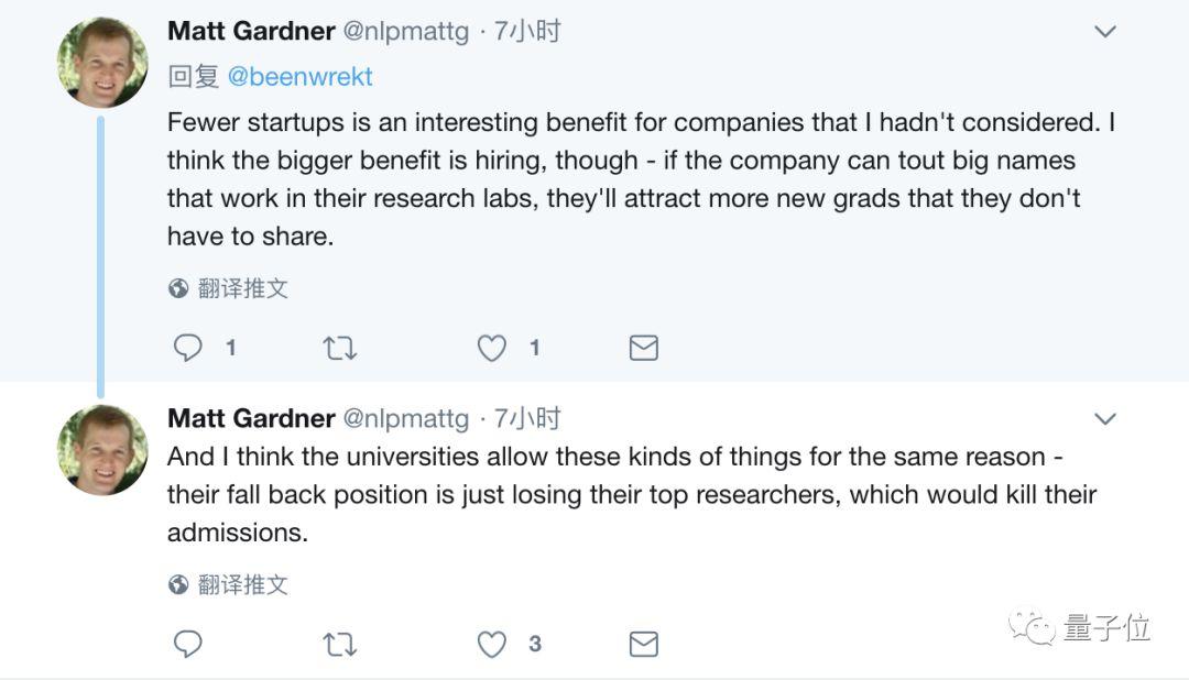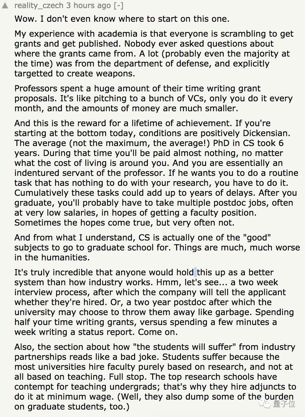 "大部分学术工作都是为了学术基金,不是什么好奇心。要是大学希望教授们不要成群结队地跑去科技公司,就应该给钱,然后别让教授们搞那些浪费时间的破事。大学应该在争取人才的道路上勇于竞争,哭哭啼啼的抱怨教授们不再恪守清贫、专心学术,有毛用?"