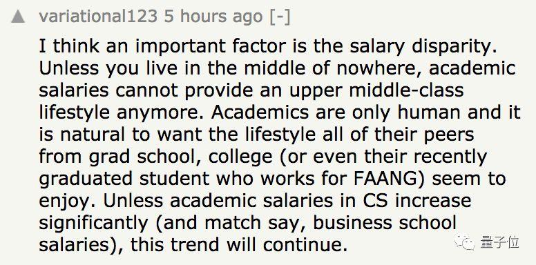 "这事还是得看工资啊,除非你呆在物价极低的地方,学校开的工资完全没法提供中产阶级的生活水平,教授们也是人,也想活得好。除非给CS教授跟商学院一样高的工资,不然大家还是都跑到产业界去。"