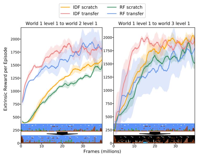 3.2 模型在《超级马里奥兄弟》新关卡的泛化能力 图 4:《马里奥》泛化实验结果。左图是 1-1 关到 1-2 关的迁移结果,右图是 1-1 关到 1-3 关的迁移结果。图下方是源和目标环境的地图。所有的智能体都是在无外在奖励的情况下训练出来的。