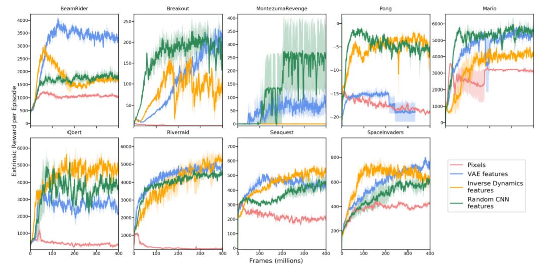论文地址:https://ift.tt/2NemKNC 摘要:强化学习算法依赖外在于智能体的工程环境奖励。但是,用手工设计的密集奖励来对每个环境进行标注的方式是不可扩展的,这就需要开发智能体的内在奖励函数。好奇心是一种利用预测误差作为奖励信号的内在奖励函数。在本文中:(a)对包括 Atari 游戏在内的 54 个标准基准环境进行了第一次大规模的纯好奇心驱动学习研究,即没有任何外在奖励。结果取得了惊艳的性能,并在许多游戏环境中,内在好奇心目标函数和手工设计的外在奖励高度一致。(b)研究了使用不同的特征空间计算预测误差的效果,表明随机特征对于许多流行的 RL 游戏基准来说已经足够了,但是学习特征似乎泛化能力更强 (例如迁移到《超级马里奥兄弟》中的新关卡)。(c)展示了随机设置中基于预测的奖励的局限性。 3 实验 3.1 无外在奖励的好奇心驱动学习 图 2:8 款 Atari 游戏和《超级马里奥兄弟》的特征学习方法对比。这些评估曲线显示了没有奖励或结束信号,仅是纯好奇心训练的 agent 平均奖励 (标准误差)。可以看到,纯好奇心驱动的 agent 无需外在奖励,就能够在这些环境中获得奖励。所有 Atari 游戏的结果都在图 8 的附录中。在像素上训练的好奇心模型在任何环境中都表现不佳,VAE 特征的表现要么与随机和反向动力特征相同,要么不如后者。此外在 55% 的 Atari 游戏中,反向动力训练的特征比随机特征表现得更好。有趣的是,好奇心模型的随机特征是一个简单却强大的基线,大致可在 Atari 的半数游戏中取得优良表现。