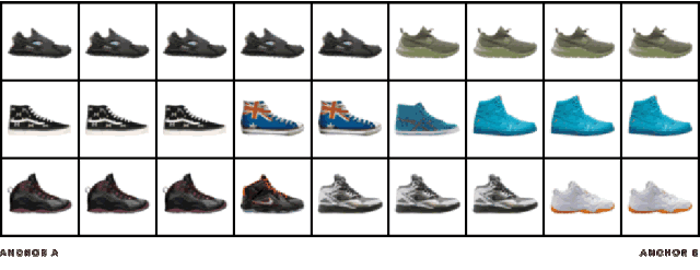 通过解码器生成照片,在逐步增加的训练迭代时,每张图像是一个固定的隐向量 该模型倾向于在每个维度创建更多独立的人类可解释因子,这称之为解纠缠(disentanglement)。首先,模型着重对比鞋底和鞋面差别来重新构建最合适的轮廓。然后,重构整个轮廓的灰色梯度,再开始学习基础颜色。在了解了轮廓类型之后,例如,靴子还是潮鞋,高帮还是低帮,网络开始处理复杂的设计款式和颜色,这些都是最终的差异性因素。 为了展示学习后的流形并检查学习曲面的"平滑度",我们通过插值法进一步可视化。选择看似不同的潮鞋作为锚点(anchors),然后判断它们在隐空间中的过渡。每个隐向量的插值被解码成图像空间的视觉检验,并与整个目录里最接近的实际产品相匹配。动图说明了映射学习特征的概念。 锚定球鞋之间的插值