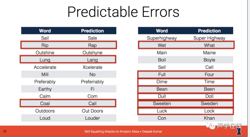 由于Alexa会用注册到amazon的云应用程序来处理用户的请求,所以它可能会创建以现有合法应用程序的同音字命名的恶意技能。 亚马逊在2017年默认通过语音命令提供其库中的所有技能,并且可以通过语音将技能"安装"到客户的库中。"不管怎样,对于那些有选择地注册技能名称的人来说,这是一种只有语音的攻击,"UIUC安全和透明系统实验室的负责人Bates说。 这种漏洞为恶意开发者提供了各种可能。他们可以建立拦截合法技能请求的技能,以驱动窃取个人和财务信息的用户交互。这基本上是用Alexa来进行钓鱼攻击(类似于"Fish Facts")。UIUC的研究人员(在沙箱环境中)演示了一种被称为"Am Express"的技能如何被用来劫持美国运通的"Amex"技能的初始请求,并窃取用户的凭证。 还有一些词语Alexa常常会识别错,这可能是由于Alexa的机器学习训练时使用了一些口音较重的音频。 为了确定其中的一部分,UIUC团队利用了来自Nationwide Speech Project的音频样本语料库——语言学研究人员Cynthia Clopper和David Pisoni收集了来自美国六大方言区的60位不同发言者的演讲样本。