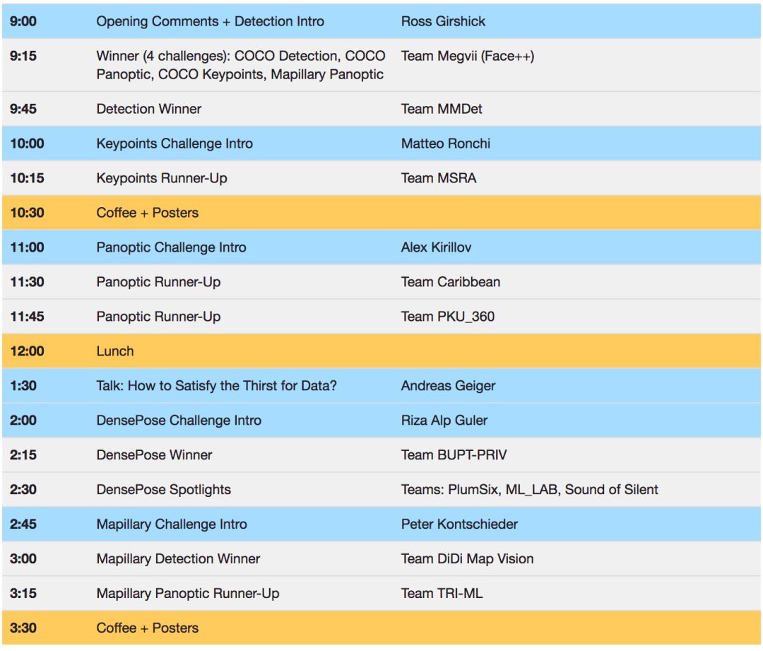 虽然其他 COCO 赛项得分还未显示在 Leaderboard 上,但我们可以从 COCO + Mapillary 联合挑战赛官网公布的 Workshop 日程上看出: COCO 关键点检测赛项:旷视科技第一,MSRA 团队第二; COCO 全景分割赛项:旷视科技第一,Caribbean 与 PKU_360 团队第二; COCO 姿态估计赛项:北京邮电大学模式识别与智能视觉实验室团队第一名; 因 Mapillary 竞赛组织方选择对以下两个比赛的结果保密,因此具体得分信息我们看不到。