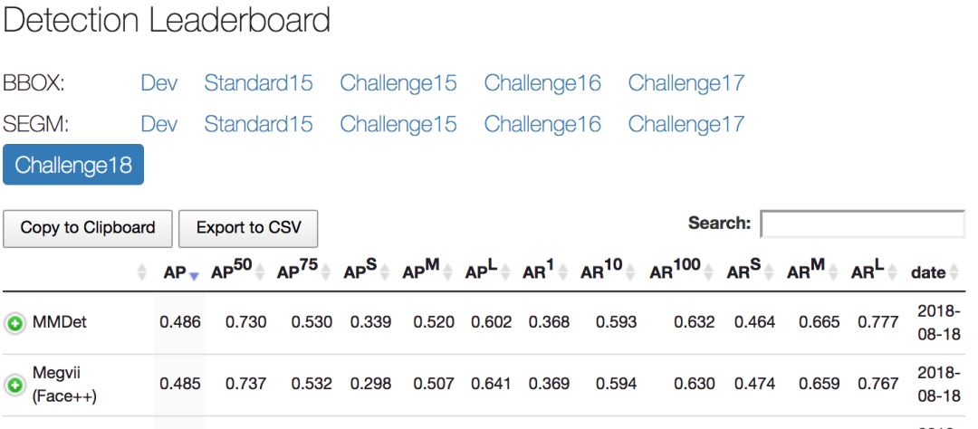 从 COCO 数据集 Detection Leaderboard 上我们可以看到,港中文 - 商汤联合实验室 MMDet 团队、旷视科技团队在 COCO 实例分割赛项上比分接近(上图中旷视科技团队与 MMDet 团队同为 Winner),MMDet 团队平均得分比旷视科技高了 0.1%。