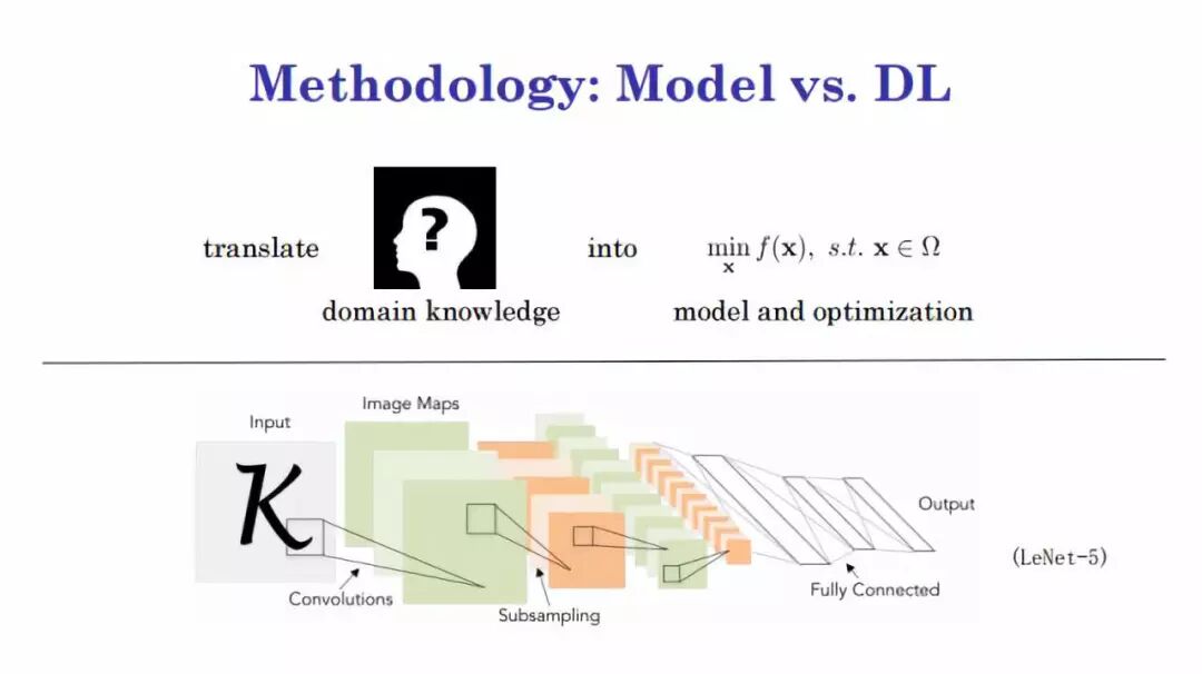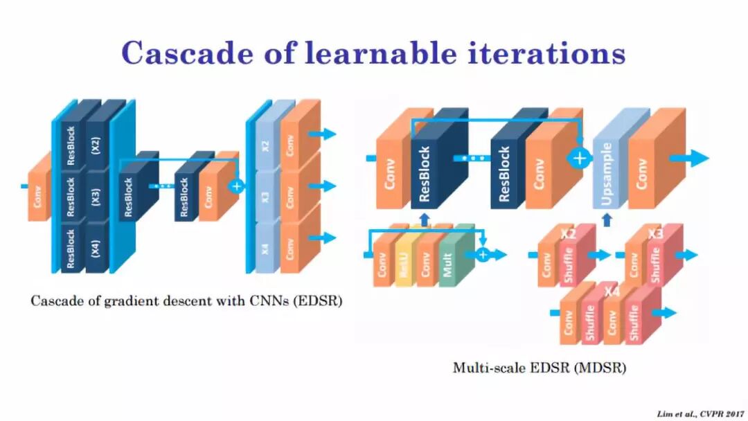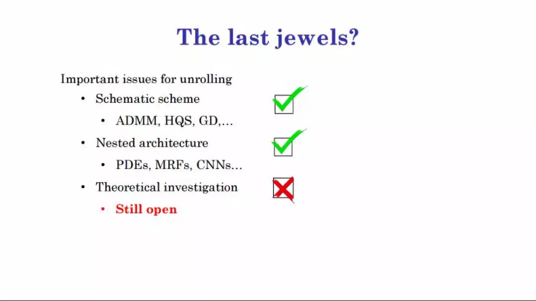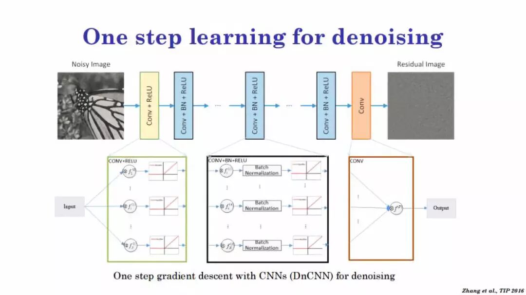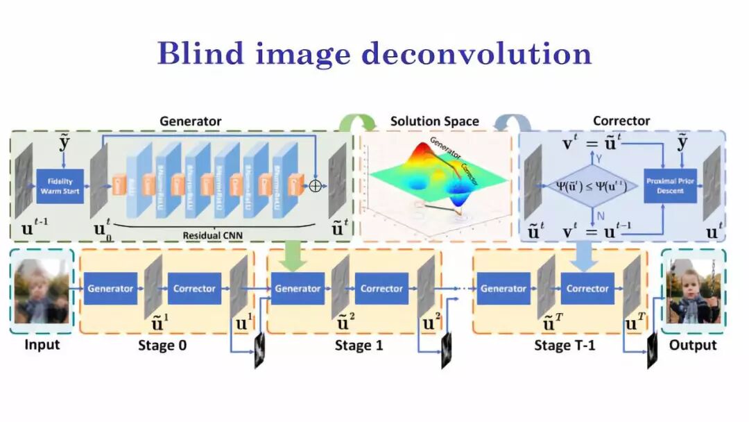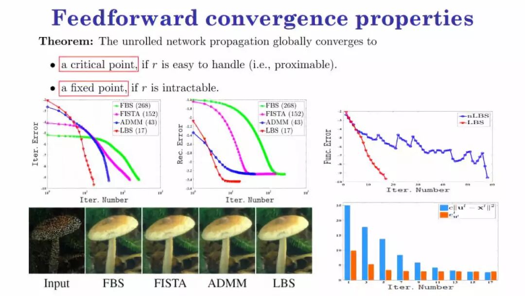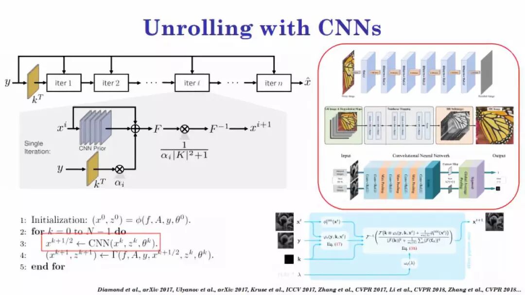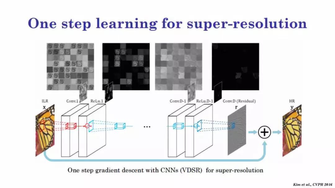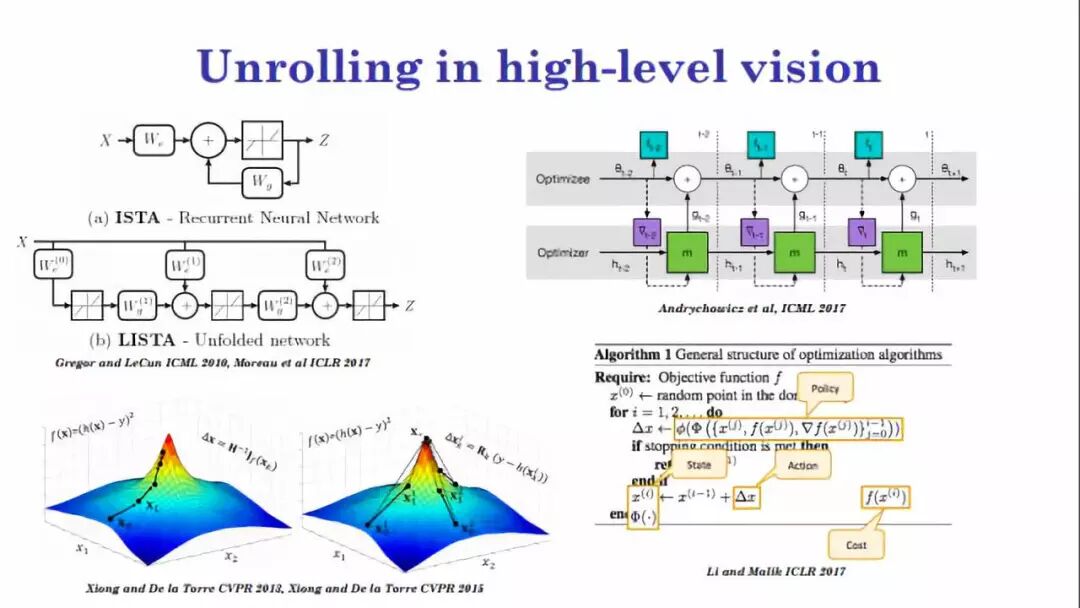 | 编者按:深度学习在计算机视觉领域取得了巨大的成功,有研究者甚至一度期望这种端到端的学习策略可以完全替代传统模型驱动的算法。然而,大量工作证明:当我们面临复杂问题的时候,完全抛弃领域知识是非常不明智的策略。因此,如何将领域知识和先验融合到深度网络中,成为深度学习领域一个新的研究热点。其中,Deep Unrolling为我们提供了一种结合知识与数据的有效手段。 本文中,来自大连理工大学的刘日升副教授,将为大家介绍基于Unrolling的深度方法及应用。文末提供文中提到参考文献的下载链接。 本次报告主要向大家汇报一下基于Unrolling的深度学习方法,其在计算机视觉领域的各种应用,以及我们近期针对该类型深度网络的一些理论分析方面的工作。 近年来,深度学习相关工作大量涌现。在早期阶段,研究者们大多基于经验和对问题的一些理解,启发式地设计网络结构,并通过端到端学习的方式得到解决具体问题的深度模型。该类方法在计算机视觉领域的一些问题中已经取得了巨大成功。比如在人脸识别、目标检测等High-level问题中,各种深度网络的性能已经远远优于传统方法。但随着相关研究的逐渐深入,学者们也发现完全启发式设计的深度网络并不能在所有视觉问题中都取得令人满意的结果。特别是在一些底层视觉问题中,直接使用端到端学习策略和经验设计网络的性能并不能令人满意。比如,现有的启发式深度网络在图像盲去模糊问题中的性能仍然无法令人满意。 为了更深刻理解深度网络的本质特点,我们首先比较一下传统模型驱动的思路和端到端学习深度网络建模方法的区别与联系。具体来说:模型驱动方法通常首先利用领域知识为问题建立数学模型,进而通过特定的优化算法或求解策略得到模型的最优解。相对应地,端到端学习方法则希望直接建立输入数据与输出结果的非线性映射关系,其性能往往与训练数据的质量和规模有密切关系。总结起来,我们发现以上两种方法分别主要侧重于利用"领域知识"或者基于"数据(及经验)"来解决计算机视觉问题。很自然的,如果我们可以有效结合这两种不同的策略,将非常有希望设计出更加强大、且可解释性更强的深度网络模型。这也引出了我们后面将向大家介绍的Deep Unrolling技术。 近年来,Unrolling技术为"领域知识"与"数据("及经验)"结合提供了一种有效手段。具体来说,所谓Unrolling是指我们将求解一个给定连续模型的迭代优化看成是一个动态系统,进而通过若干可学习模块来离散化这一系统,得到数据驱动的演化过程(Data-dependent Propagation)的方法。实际上,Unrolling过程与机器学习领域的元学习(Meta Learning)和近期LeCun等人提出的可微分编程(Differentiable Programming)概念也有着非常密切的内在联系。 在Unrolling方法中,我们首先需要设计一个迭代框架(Schematic Scheme),在此基础上进一步将可学习模块嵌入到迭代中。更为重要的是,我们还需要对于所设计的演化过程进行必要的理论分析。 接下来,我们将对计算机视觉领域中使用Unrolling思想的方法进行简要回顾。需要指出的是,在一些工作中,其原始论文虽然没有显式地使用Unrolling的概念,但我们仍然可以通过Unrolling框架对这些方法的原理和有效性进行解释和分析。 偏微分方程/扩散过程是非常经典的一类图像处理方法。该类方法实质上可以考虑为求解一个变分能量的梯度流。我们在2010年首先提出基于学习的偏微分方程(Learning-based PDE)解决各种不同的图像处理(去噪、分割、去马赛克等)问题。该方法最大的特点是通过学习旋转与平移不变的基本微分不变量来实现对扩散过程的Unrolling。并通过最优控制技术实现系统参数的端到端学习。值得指出的是,基于学习的偏微分方程实际上就是一种基于微分算子的、结构简化的深度网络模型。此外,我们所采用的最优控制框架也与现在被广泛使用的反向传播技术有着深刻的本质联系。随后,Chen 和Pork的工作则使用更高阶的算子来进行扩散学习,解决图像去噪等问题。 MRF作为一类无向图上的参数化先验,也可以被用来刻画不同类型图像的潜在分布规律。近年来,通过使用不同的优化策略(如半二次分裂、原始对偶、交替方向等)作为基础迭代格式,并使用高阶滤波器对MRF先验进行Unrolling,学者们提出了一系列不同的图像增强算法,并在不同的应用领域取得了较好的效果。 由于CNN实质上也可以看成是一种高阶的扩散算子,因此直接使用CNN对优化迭代过程进行Unrolling成为最近一两年来非常热门的研究方向。各种不同的CNN结构和Unrolling思路大量涌现。这里需要指出的是,Unrolling方法中CNN不再是一个端到端的回归器。实质上,我们更倾向于认为其学习的是优化算法在真实数据上每步计算所产生的迭代误差(或模型误差)。因此在这类Unrolling方法中,我们往往使用不同强度的高斯噪声来训练迭代过程中的CNN模块。 接下来,我们将进一步使用Unrolling思想对几类在底层视觉领域取得成功的深度网络方法进行分析与理解。 VDSR是一种将残差结构(Residual Structure)应用到图像处理问题上的深度学习方法,其在超分辨率问题上取得了非常好的效果。我们通过分析发现,VDSR网络结构实际上可以被理解成为一个一步的梯度下降过程。而CNN则学习了我们从低分辨率输入到高分辨率输出的下降方向。 相对于较早期的超分辨率网络(如SRCNN等,