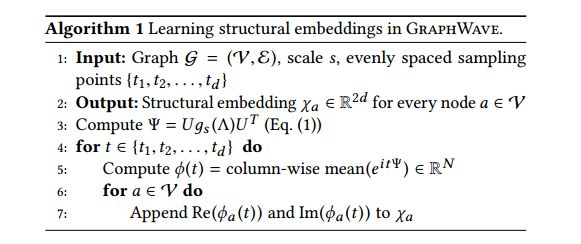 GraphWave 基于以该节点为中心的谱图小波的扩散,学习每个节点的结构嵌入。直观地,每个节点在图上传播能量单位,并基于网络对该探测的响应来表征其相邻拓扑。
