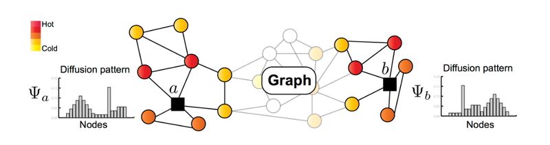 在上图中,节点 a 和 b 具有相似的局部结构角色,即使它们在图中很远。虽然 a 和 b 的原始光谱图小波签名/系数 Ψ 可能非常不同,但 GraphWave 将它们视为概率分布,因此可以自动了解系数分布确实相似。Graphwave 利用这些新见解,基于以节点 a/b 为中心的谱图小波的扩散,学习节点 a/b 的结构嵌入。