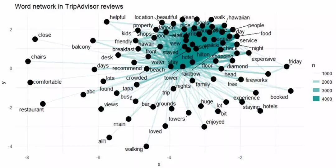 Figure 5 最常见的二元词组是"rainbow tower"(彩虹塔),其次是"hawaiian village"(夏威夷村)。 我们可以利用网络可视化来展示这些二元词组: review_subject <- df %>% unnest_tokens(word, review_body) %>% anti_join(stop_words) my_stopwords <- data_frame(word = c(as.character(1:10))) review_subject <- review_subject %>% anti_join(my_stopwords) title_word_pairs <- review_subject %>% pairwise_count(word, ID, sort = TRUE, upper = FALSE) set.seed(1234) title_word_pairs %>% filter(n >= 1000) %>% graph_from_data_frame() %>% ggraph(layout = "fr") + geom_edge_link(aes(edge_alpha = n, edge_width = n), edge_colour = "cyan4") + geom_node_point(size = 5) + geom_node_text(aes(label = name), repel = TRUE, point.padding = unit(0.2, "lines")) + ggtitle('Word network in TripAdvisor reviews') theme_void()
