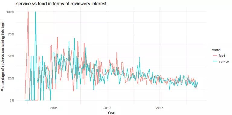 Figure 9 这张图展示了自2010年以来逐渐变少的主题。这些词包括"hhv" (我认为这是 hilton hawaiian village的简称), "breakfast"(早餐), "upgraded"(升级), "prices"(价格) and "free"(免费)。 让我们对一些单词进行比较。 word_month_counts %>% filter(word %in% c("service", "food")) %>% ggplot(aes(month, n / month_total, color = word)) + geom_line(size = 1, alpha = .8) + scale_y_continuous(labels = percent_format()) + expand_limits(y = 0) + labs(x = "Year", y = "Percentage of reviews containing this term", title = "service vs food in terms of reviewers interest")