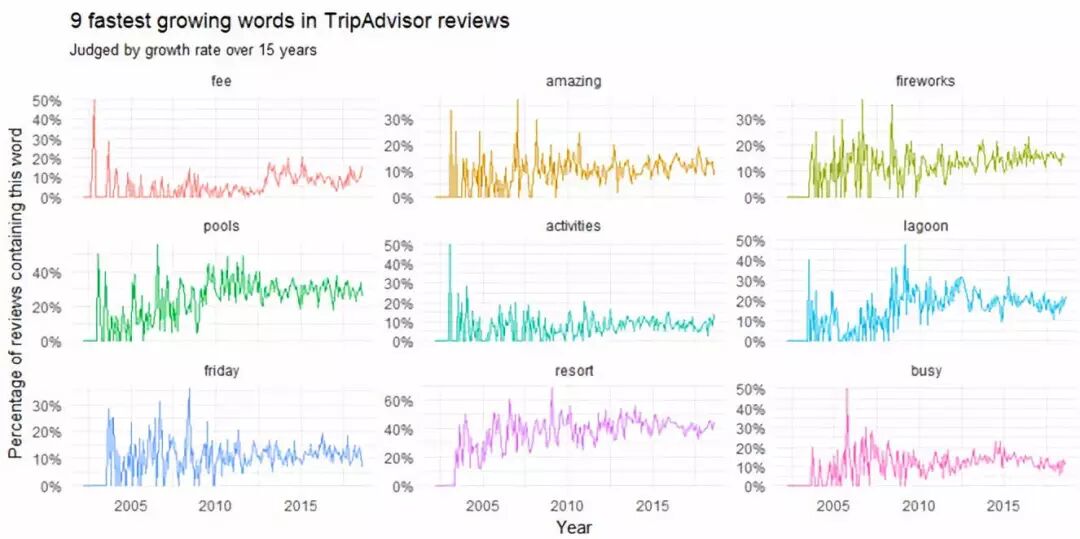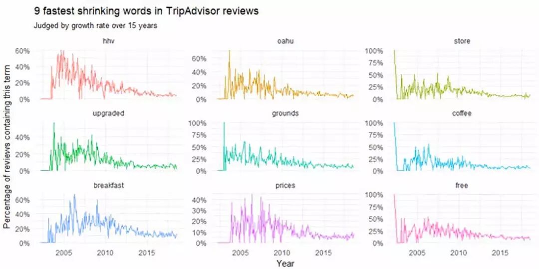 Figure 7 最常见的三元词组是"hilton hawaiian village",其次是"diamond head tower",等等。 评论中关键单词的趋势 随着时间的推移,哪些单词或话题变得更加常见,或者更加罕见了呢?从这些信息我们可以探知酒店做出的调整,比如在服务上,翻新上,解决问题上。我们还可以预测哪些主题会更多地被提及。 我们想要解决类似这样的问题:随着时间的推移,在TripAdvisor的评论区中哪些词出现的频率越来越高了? reviews_per_month <- df %>% group_by(month) %>% summarize(month_total = n()) word_month_counts <- review_words %>% filter(word_total >= 1000) %>% count(word, month) %>% complete(word, month, fill = list(n = 0)) %>% inner_join(reviews_per_month, by = "month") %>% mutate(percent = n / month_total) %>% mutate(year = year(month) + yday(month) / 365) mod <- ~ glm(cbind(n, month_total - n) ~ year, ., family = "binomial") slopes <- word_month_counts %>% nest(-word) %>% mutate(model = map(data, mod)) %>% unnest(map(model, tidy)) %>% filter(term == "year") %>% arrange(desc(estimate)) slopes %>% head(9) %>% inner_join(word_month_counts, by = "word") %>% mutate(word = reorder(word, -estimate)) %>% ggplot(aes(month, n / month_total, color = word)) + geom_line(show.legend = FALSE) + scale_y_continuous(labels = percent_format()) + facet_wrap(~ word, scales = "free_y") + expand_limits(y = 0) + labs(x = "Year", y = "Percentage of reviews containing this word", title = "9 fastest growing words in TripAdvisor reviews", subtitle = "Judged by growth rate over 15 years")