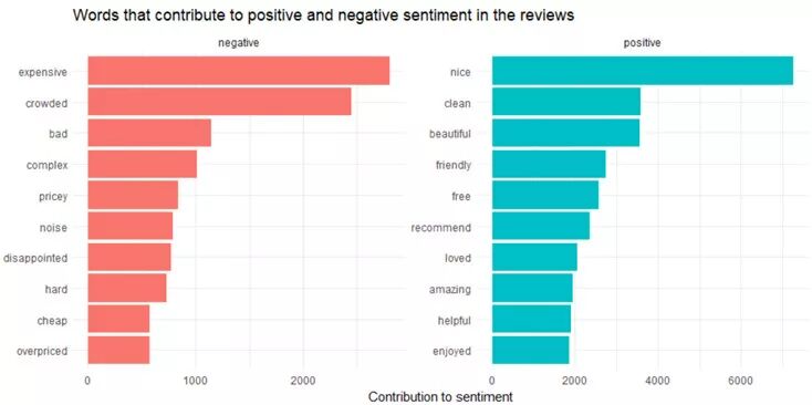在2010年之前,服务(service)和食物(food)都是热点主题。关于服务和食物的讨论在2003年到达顶峰,自2005年之后就一直在下降,只是偶尔会反弹。 情感分析被广泛应用于对评论、调查、网络和社交媒体文本的分析,以反映客户的感受,涉及范围包括市场营销、客户服务和临床医学等。 在本案例中,我们的目标是对评论者(也就是酒店旅客)在住店之后对酒店的态度进行分析。这个态度可能是一个判断或是评价。 下面来看评论中出现得最频繁的积极词汇和消极词汇。 reviews <- df %>% filter(!is.na(review_body)) %>% select(ID, review_body) %>% group_by(row_number()) %>% ungroup() tidy_reviews <- reviews %>% unnest_tokens(word, review_body) tidy_reviews <- tidy_reviews %>% anti_join(stop_words) bing_word_counts <- tidy_reviews %>% inner_join(get_sentiments("bing")) %>% count(word, sentiment, sort = TRUE) %>% ungroup() bing_word_counts %>% group_by(sentiment) %>% top_n(10) %>% ungroup() %>% mutate(word = reorder(word, n)) %>% ggplot(aes(word, n, fill = sentiment)) + geom_col(show.legend = FALSE) + facet_wrap(~sentiment, scales = "free") + labs(y = "Contribution to sentiment", x = NULL) + coord_flip() + ggtitle('Words that contribute to positive and negative sentiment in the reviews')