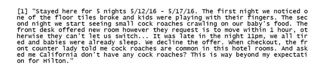 Figure 19 最消极的评论来自于ID为3748的记录:"(我)住了5晚(16年5月12日-5月17日)。第一晚,我们发现地砖坏了,小孩子在玩手指。第二晚,我们看到小蟑螂在儿童食物上爬。前台给我们换了房间,但他们让我们一小时之内搬好房间,否则就不能换房。。。已经晚上11点,我们都很累了,孩子们也睡了。我们拒绝了这个建议。退房的时候,前台小姐跟我讲,蟑螂在他们的旅馆里很常见。她还反问我在加州见不到蟑螂吗?我没想到能在Hilton遇到这样的事情。" df[ which(df$ID==3748), ]$review_body[1]