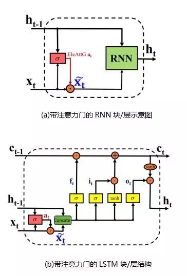 即(x_t) ̃取代原始输入x_t参与到RNN的循环运算。元素注意力门的响应向量由输入和隐状态决定: