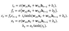 图1 RNN结构示意图及沿时域的展开表示 标准(Standard)RNN存在梯度消失的问题,因此在对长时(Long Range)依赖性建模中性能并不理想。LSTM(Long Short-Term Memory)、GRU(Gated Recurrent Unit)通过引入门(Gate)设计一定程度上减轻了梯度消失问题。门结构根据当前输入和隐状态信息来控制着对历史信息遗忘量,以及对当前输入信息接纳量,从而实现对历史和当前信息的有效利用。 对于一个RNN神经元,门可以视为一个整体的开关(标量)在控制当前或历史信息的流通。以某个LSTM神经元为例,在时刻t,内部单元的响应计算如下: