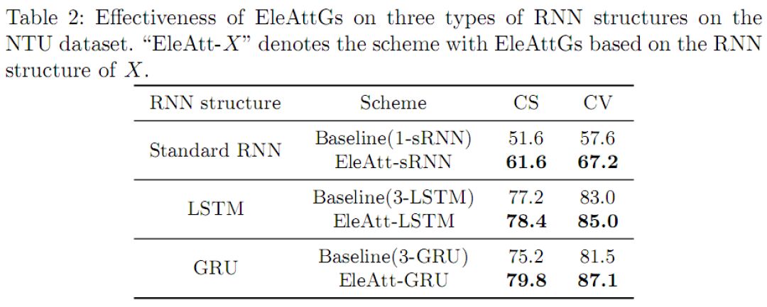 元素注意力门可用到不同RNN结构 我们在三种代表性RNN结构上,即标准RNN、LSTM和GRU,分别验证设计的有效性。如表2所示,由于注意力门的引入,识别性能在三种结构上均实现了显著的提升。