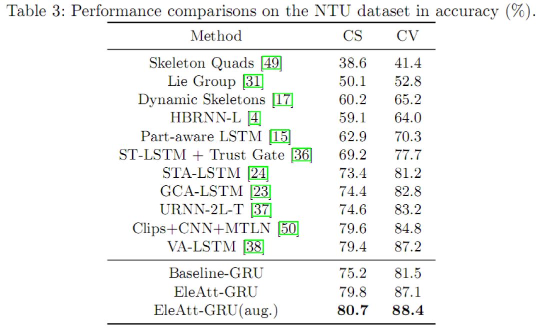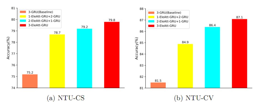 过去许多注意力设计工作中采用Softmax作为激活函数,从而使得注意力值的和为1。这样,在同一时刻,某个元素上的注意力值大小会受到其它元素上注意力值的影响。例如,沿着时间注意力稳定的一个元素因此会由于其他元素的改变而其稳定性被破坏。我们放宽了该限制,通过采用Sigmoid激活函数,保证了输入向量中某个元素的重要性不会由于其他元素的重要性值的改变而被迫改变,从而有更大优化空间。实验中我们发现放宽该约束可以显著地提升3D行为识别的性能。 元素注意力门的加入,使得RNN神经元拥有了注意能力。理论上讲,每个RNN神经元可以拥有自己的元素注意力门。为了减少计算复杂度和参数量,在我们的设计中,同一RNN层中的所有RNN神经元共享元素注意力门参数。 为了检验元素注意力RNN的高效性,我们在基于3D骨架(3D skeleton)数据的行为识别,以及基于RGB的行为识别上分别做了实验。 在基于3D骨架的人类行为识别的任务上,我们使用3个RNN层和一个全连层来搭建基准分类网络。每个RNN层由100个RNN神经元组成。作为比较,我们的方案将3个RNN层替换为3个元素注意力RNN层。 我们主要在NTU RGB+D数据库(简称NTU数据库)上进行实验分析。NTU是目前最大的Kinect采集的用于3D行为识别的数据库,包含56880个序列,由60类日常行为组成。骨架数据中,每个人由25个关节点组成。 在基于RGB帧的行为识别任务上,对于一个RGB帧,我们将CNN提出的特征向量作为RNN网络的一个时刻的输入来利用空时信息进行序列分类。类似地,作为比较,对比方案中将RNN层替换为了元素注意力RNN。 元素注意力门的有效性我们在NTU数据库上通过基于3D骨架的行为识别任务来分析元素注意门的效率。如图3所示,对于3层GRU网络,当第一层GRU被换为元素注意力GRU后,识别精度在Cross-Subject和Cross-View的设置下分别提升了3.5%和3.4%。随着替换层数的增加,性能也随之增加。当三层均被替换为元素注意力GRU后,识别精度较之于基准网络实现了4.6%和5.6%提升。元素注意力RNN层作为通用的设计,可以用在RNN网络的任何一层。