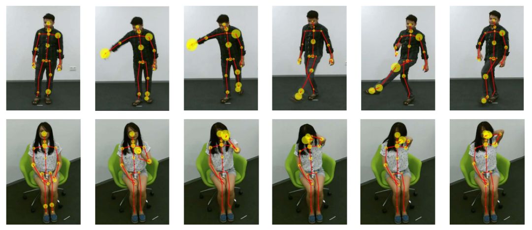 图4 训练时的损失曲线图。该实验分别在NTU数据库的Cross-Subject和Cross-View设置上进行来比较原始GRU(Baseline-GRU)和提出的元素注意力GRU(EleAtt-GRU)的收敛特性。实线表示训练集合上的结果,虚线表示验证集合上的结果。 可视化分析为了更好地理解注意力机制是如何工作的,我们基于学到的第一层GRU的元素注意力门的响应进行了可视化,如图4所示。对于以3D骨架为输入的行为识别,RNN网络的第一层的输入为J个骨架节点的3D坐标,即维度为3J。在每个时刻,元素注意力门自适应地对每个元素乘上一个注意力权重值。图4用圆圈的大小来表示每个节点相对注意力值的大小(为了便于可视化,我们将一个节点的X、Y、Z坐标上的相对注意力值的和作为该节点的注意力相对值),圈越大表示相对注意力值越大。