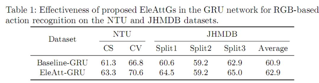 图3 对提出的元素注意力门在三层GRU网络上的性能分析(分类精度%)。m-EleAtt-GRU+n-GRU"表示前m层是提出的元素注意力GRU层,其余n层为原始GRU层。"3-GRU(Baseline)"是原始GRU构成的基准网络。该实验在基于3D骨架的行为识别任务上的NTU数据库的Cross-Subject(CS)和Cross-View(CV)设置下完成。 元素注意力RNN可用于建模其它信号元素注意力RNN层作为一个通用设计,除了3D骨架数据,也可以被用于处理其它数据。在这里,我们通过使用CNN在RGB帧提取的特征作为RNN网络的输入,来验证该注意力机制在CNN特征上仍然有效。表1比较了元素注意力GRU(EleAtt-GRU)和原始GRU (Baseline-GRU)在基于RGB的视频行为识别上的性能,其显示元素注意力GRU比原始GRU识别精度高2%-3.8%。