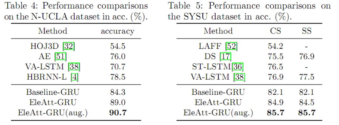 图5 在基于3D骨架的人类行为识别任务上,根据第一层元素注意力GRU上注意力门响应值的大小在各个骨架节点上进行可视化。 对于第一行的"踢腿"行为,相对注意力值在对行为识别比较重要的脚节点上较大。对于第二行的"触摸脖子"行为,相对注意力值在手和头节点上比较大,而在不相关的脚节点上很小。这表明学到的注意力能关注于更有判别力的节点,和人的认知相符。 和其它先进方法的比较表3、4、5中对比了我们的方法和现有的方法在NTU、N-UCLA和SYSU 3D骨架行为识别数据库上的比较。由于有效的注意力机制设计,我们方法实现了最好的性能。