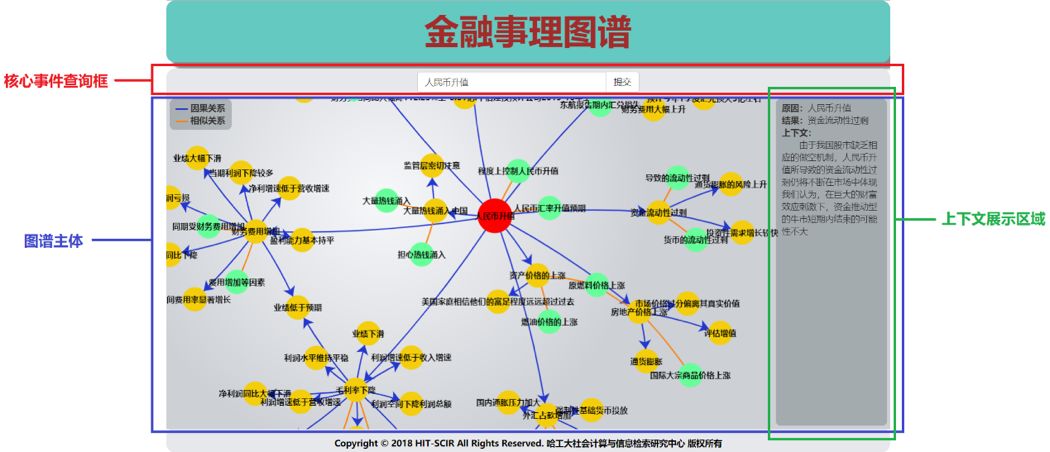 图1. 事理图谱和知识图谱的区别与联系 二、金融事理图谱的构建 基于上述对事理图谱概念的定义,我们在金融领域语料上进行了探索与实践,经过多次迭代与完善,构建了一个金融领域的事理图谱。构建该金融事理图谱所用的语料为腾讯、网易、和讯等网站的财经新闻文本,以及人民日报、中国青年报等多家报纸的开放领域新闻文本。构建该图谱用到了事件抽取、因果关系抽取、相似事件识别等关键技术。目前该金融事理图谱中含有约134万事件节点(用一个短语或句子来表示事件)以及约140万的因果关系。从该图谱中随机选取1000条因果关系对进行人工评价,因果事件关系抽取准确率达到了72.5%。 三、金融事理图谱Demo使用说明 基于上述构建的金融领域事理图谱,我们开发、搭建了相应的前端展示平台,供用户浏览和使用。我中心在此正式发布该Demo,地址为http://eeg.8wss.com。鉴于该Demo的展示特点,建议大家在电脑网页端进行浏览,效果较好。用户可以点击页面右上方的"使用说明"来了解Demo的使用方法。下面对该Demo的使用进行简要说明,主要有以下功能: 1. 输入事件进行搜索查询 用户在搜索框中输入,或者从候选事件列表中选择一个事件(例如"通胀","粮食减产","人民币升值"等),并点击提交按钮后,系统会自动在数据库中进行精确匹配,如果没有精确匹配结果则会进行模糊匹配。如果有匹配结果,则会在网页灰色区域呈现一个围绕输入事件扩展开的事理图谱子图。默认情况下,该子图围绕输入事件向外扩展3层。该子图可以用鼠标拖动灰色区域移动位置,用鼠标滚轮实现缩放。如图2所示,是提交"人民币升值"事件后显示的结果,图中用不同的颜色区分了不同的显示元素:红色节点为输入的核心事件,黄色节点和绿色节点表示围绕核心事件展开的事件节点;蓝色箭头有向边连线从原因事件节点指向结果事件节点,橙色无向边连接两个相似事件。