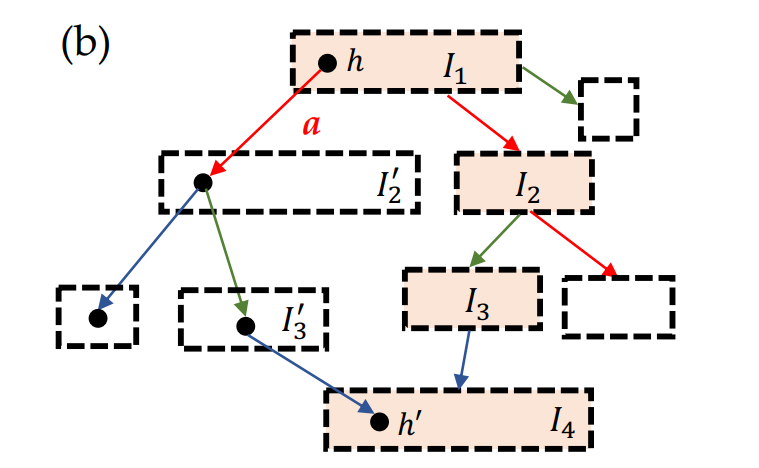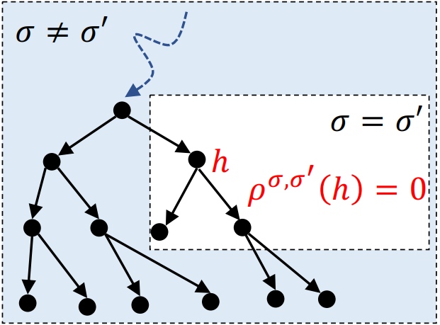 假设带阴影的这些信息集(Information Set)上的策略需要优化,但问题在于如果改变了上游的策略,则下游信息集内各状态的可到达概率就会发生各种变化,从而隐含地改变下游的期望得分;而下游策略的改变,又会改变上游的期望得分。