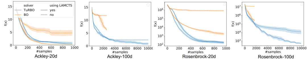 LaMCTS可以套在任何已知的黑盒优化算法上,一定程度上提高它们的性能。