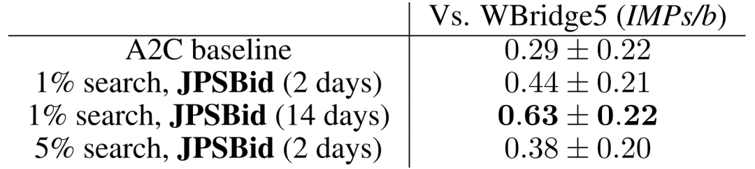 们先用A2C自对弈训练了一个还不错的基线策略,然后用上文提到的联合策略搜索(JPS)来改进队友间的叫牌约定,并且和目前较好的桥牌AI软件(WBridge5)进行了一千局开闭室比赛。