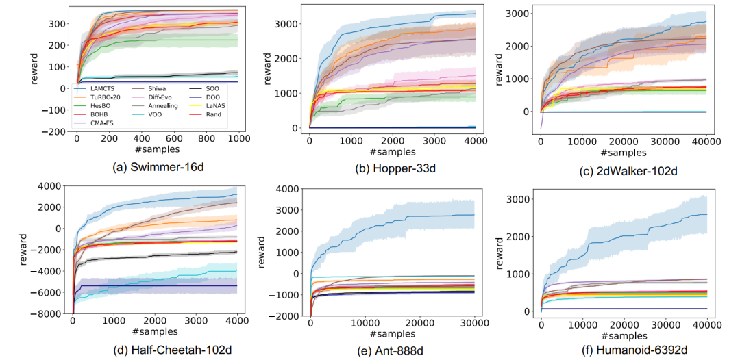 通过这个方式,特别对于高维问题达到同样性能,我们发现LaMCTS可以达到更低的样本复杂度。这里我们在Mujoco的任务上做了测试,和各种已有的黑盒算法进行了比较,蓝线是我们的方法:
