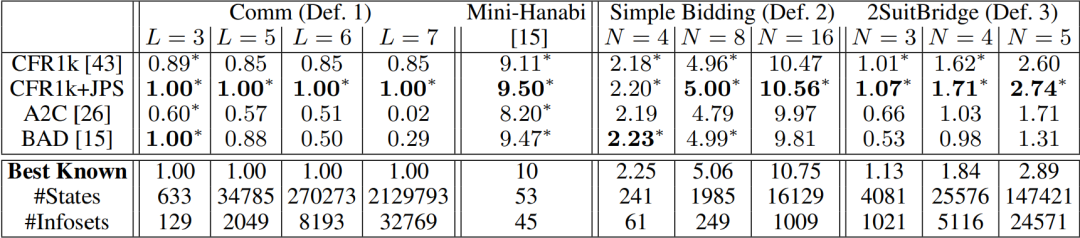 运用这个方法,我们先在一些小规模的非完美信息合作游戏(主要是桥牌叫牌阶段的简化版)上进行了测试。我们从CFR得到的联合策略开始,用搜索算法对当前的联合策略进行改进(CFR1k+JPS),直到陷入局部极大值为止。结果发现确实有用,新的策略都改进了得分,而且越复杂的游戏,改进越大。
