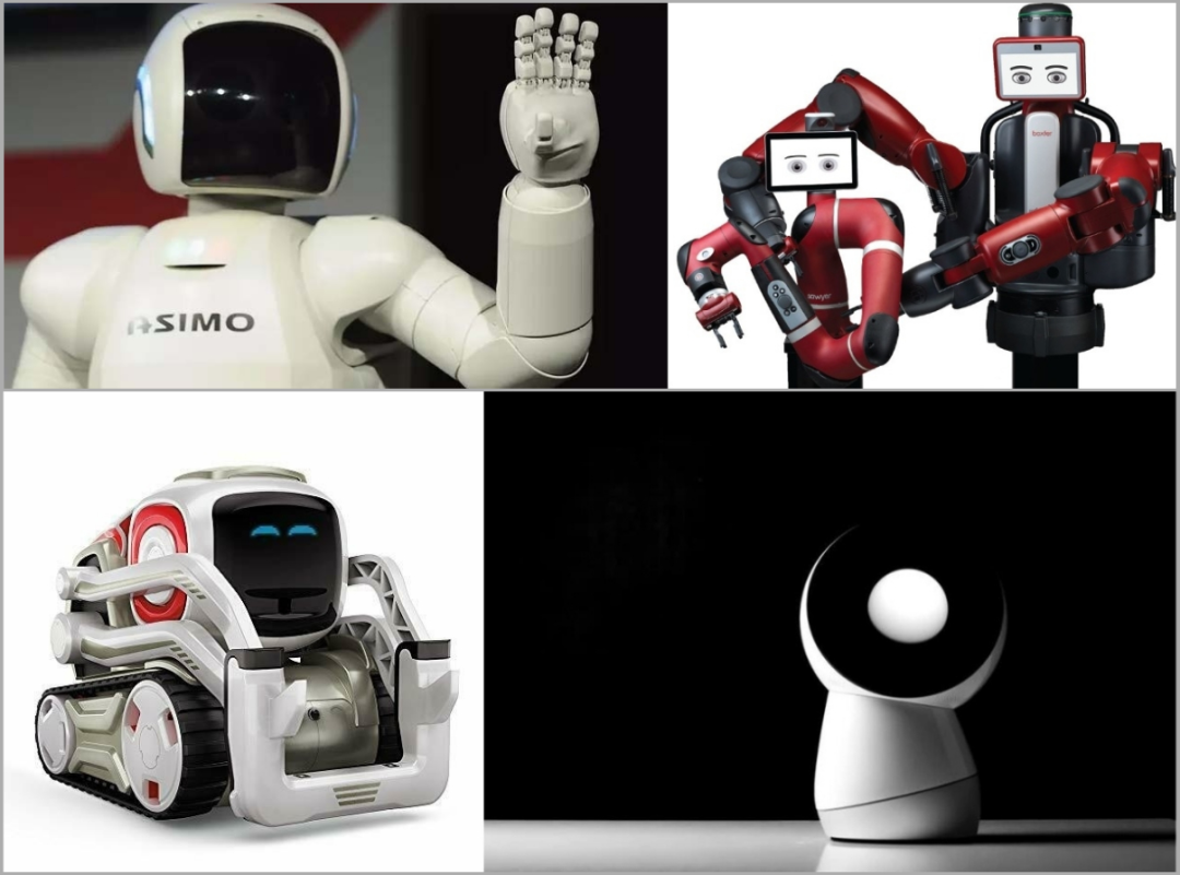 1. 本田类人型机器人 ASIMO;2. Rethink Robotics 两款标志性协作机器人,单臂机器人 Sawyer(左)和双臂机器人 Baxter(右);3. Anki 教育娱乐机器人 Cozmo;4. 全球首款家庭社交机器人 Jibo。图片均来自网络。