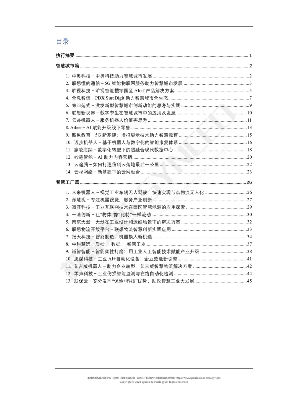 我们将首期交流会的精华内容整理为报告,汇总了来自智慧城市、智慧工厂两大领域的 27 家技术创新型创业公司的成功案例。附首期报告目录: