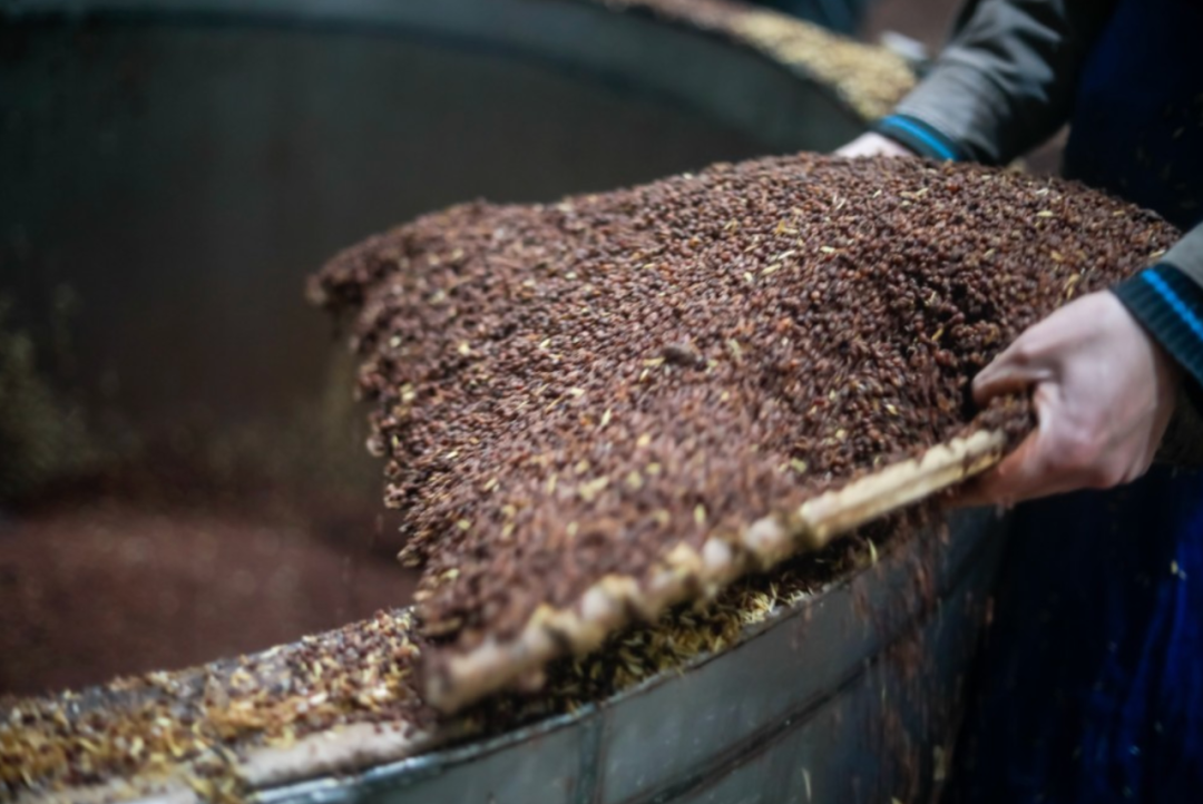 上图展示的即为白酒蒸馏过程中「上甑」的操作。我国的白酒使用甑桶进行蒸馏,传统的上甑过程需要人守在甑桶旁,桶底有净水在加热下不断冒出水蒸气,然后人将酒醅(即图中棕色颗粒,其中含有发酵好的酒份)打散一层一层铺上去,这样酒份会随着热气蒸发而出,之后冷凝为液体,再经过浓缩,就成了我们平时喝的白酒。