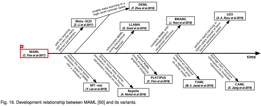 许多近期提出的 Learn-to-Finetune 方法属于 MAML 变体,下图 16 展示了 MAML 与其变体之间的关系: