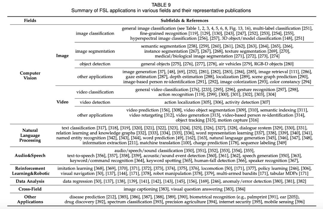 下表 9 总结了 FSL 方法在计算机视觉、自然语言处理、音频、强化学习和机器人学、数据分析等领域的应用:
