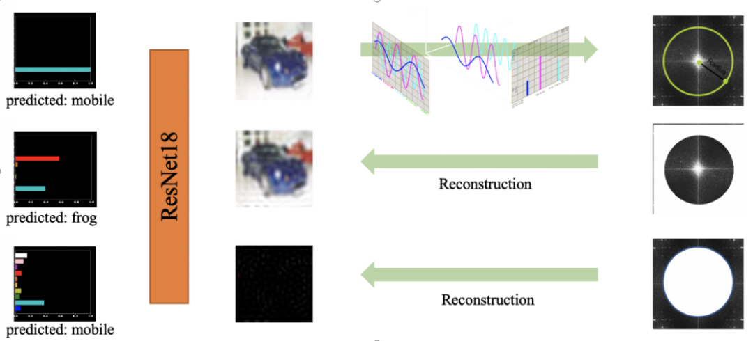 人与模型视觉上的区别:低频重建的图片与原图看起来几乎一致,却被模型预测成了不同的 label。高频重建的图片人眼几乎无法识别,模型却能成功预测出原来的 label。