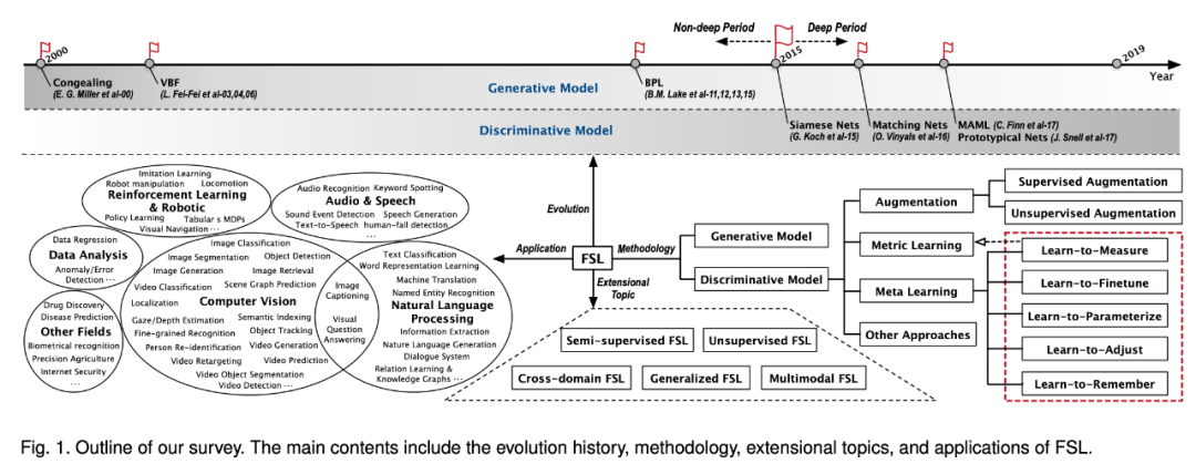 这篇综述文章回顾了 FSL 的演进历史和当前进展,将 FSL 方法分为基于生成模型和基于判别模型两大类,并重点介绍了基于元学习的 FSL 方法。