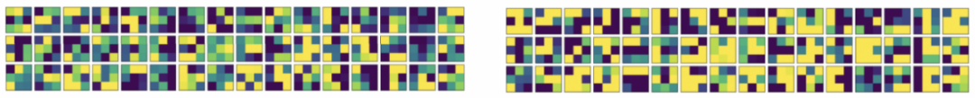 左:普通卷积神经网络的卷积核的可视化;右:对对抗攻击鲁棒的卷积神经网络的卷积核的可视化。