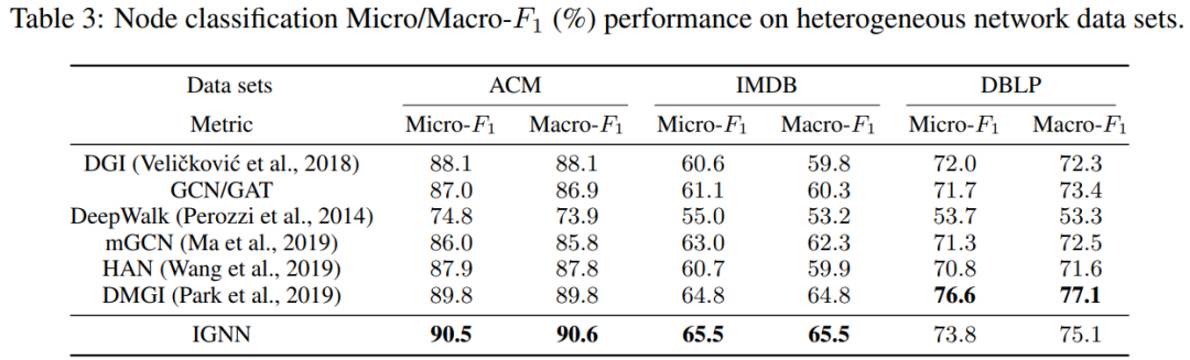 异构网络数据集上节点分类 Micro/Macro-F_1 的结果比较。
