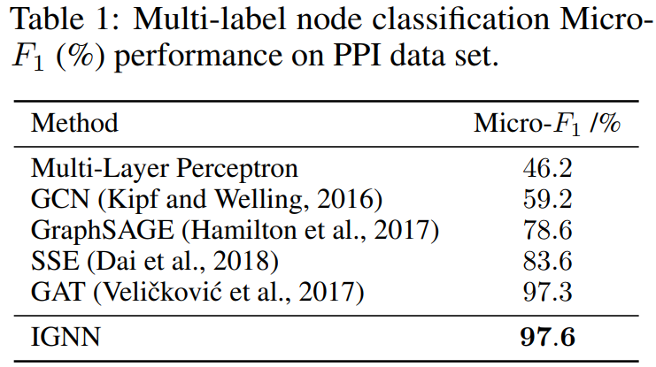 IGNN 与其他模型在 PPI 数据集中的多标签节点分类 Micro-F_1 的结果比较。