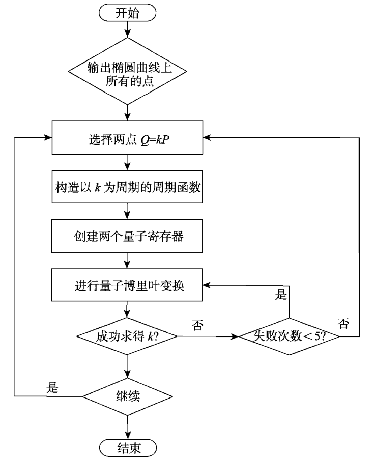 Shor 算法求解椭圆曲线离散对数 k 的流程图。