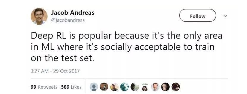 很多著名学者也纷纷加入讨论。目前普遍的观点是,DRL 可能有 AI 领域最大的泡沫。机器学习专家 Jacob Andreas 发了一条意味深长的 tweet 说: