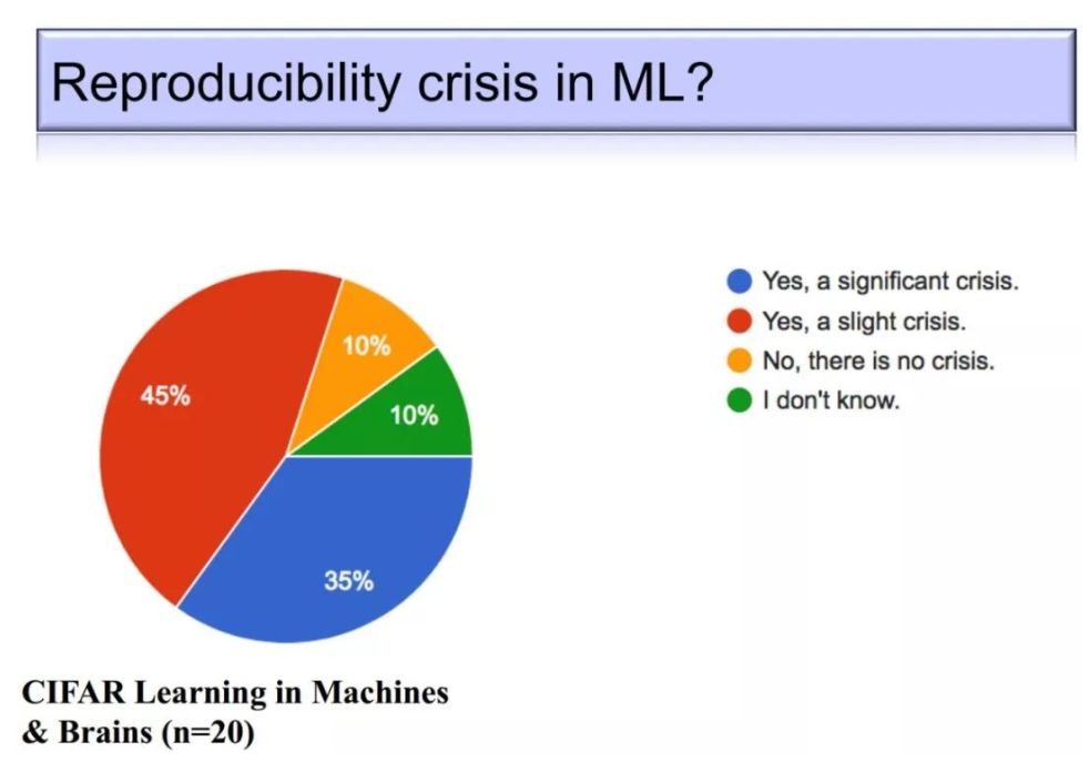 在另一项调查中,不同领域的研究者几乎都有很高的比例无法复现他人甚至自己过去的实验。可见“可复现性危机”有多么严峻!Pineau 针对机器学习领域发起的一项调研显示,同样有 90% 的研究者认识到了这个危机。