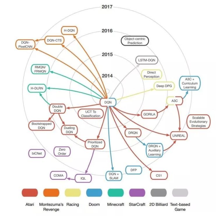 回到人工智能领域。DL 取得成功后,与 RL 结合成为 DRL。知识库相关的研究取得成功后,RL 算法中也逐渐加入了 Memory 机制。而变分推理也已经找到了与 RL 的结合点。近期学界开始了反思 DL 的热潮,重新燃起对因果推理与符号学习的兴趣,于是也出现了关系 RL 和符号 RL[66] 相关的工作。通过回顾学术的发展,我们也可以总结出人工智能发展的一个特点:每当一个相关方向取得突破,总是会回归到 RL 问题, 寻求与 RL 相结合。与其把 DRL 看作 DL 的拓展,不如看作 RL 的一次回归。因此我们不必特别担心 DRL 的泡沫,因为 RL 本就是人工智能的最终目标,有着旺盛的生命力,未来还会迎来一波又一波的发展。