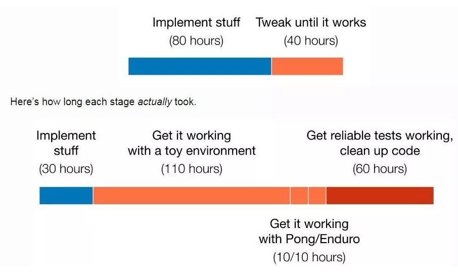 另一位 DRL 研究者 Matthew Rahtz 则通过讲述自己试图复现一个 DRL 算法的坎坷历程来回应 Alexirpan,让大家深刻体会了复现 DRL 算法有多么难 [15]。半年前,Rahtz 出于研究兴趣,选择对 OpenAI 的论文 Deep Reinforcement Learning from Human Preferences 进行复现。在复现的过程中,几乎踩了 Alexirpan 总结的所有的坑。他认为复现 DRL 算法与其是一个工程问题,更不如说像一个数学问题。“它更像是你在解决一个谜题,没有规律可循,唯一的方法是不断尝试,直到灵感出现彻底搞明白。……很多看上去无关紧要的小细节成了唯一的线索……做好每次卡住好几周的准备。”Rahtz 在复现的过程中积累了很多宝贵的工程经验,但整个过程的难度还是让他花费了大量的金钱以及时间。他充分调动不同的计算资源,包括学校的机房资源、Google 云计算引擎和 FloydHub,总共花费高达 850 美元。可就算这样,原定于 3 个月完成的项目,最终用了 8 个月,其中大量时间用在调试上。
