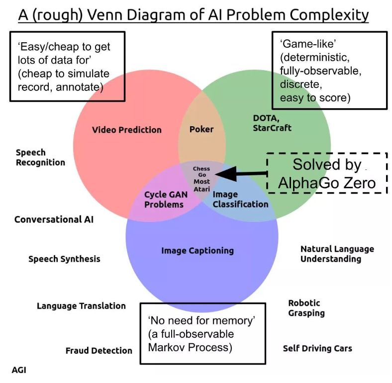 DQN 和 AlphaGo 系列工作给人留下深刻印象,但是这两种任务本质上其实相对“简单”。因为这些任务的环境是确定的、静态的,状态主要是离散的、静态的、完全可观察的,反馈是确定的,代理也是单一的。目前 DRL 在解决部分可见状态任务(如 StarCraft),状态连续的任务(如机械控制任务),动态反馈任务和多代理任务中还没取得令人惊叹的突破。